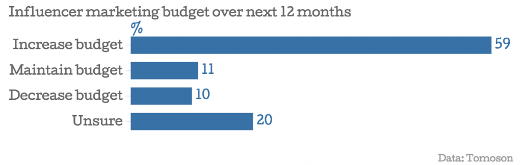 Most marketers are increasing their influencer marketing budgets over the next 12 months, with just 11% maintaining current levels and 10% planning to reduce spending. Now is a good time to reach deals with influencers, before they get too busy with increased demand.