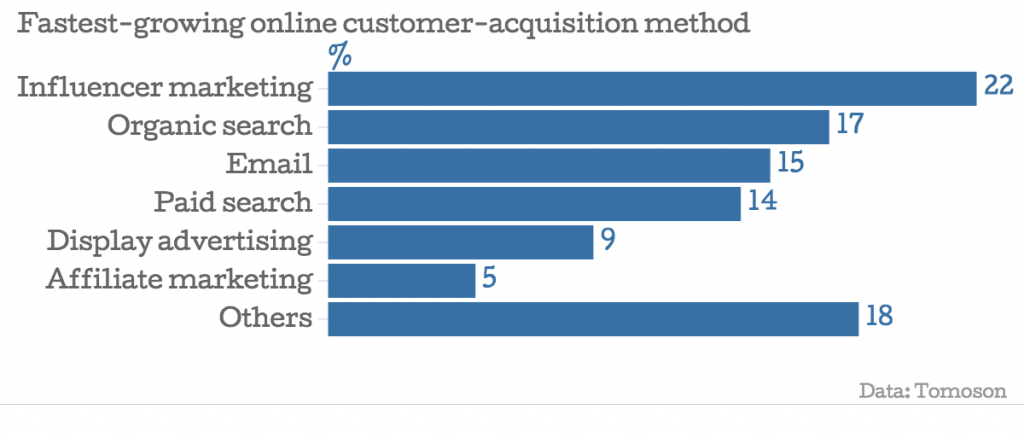 Marketers rated influencer marketing as their fastest-growing channel for acquiring customers online. Organic search and email are too mature to provide the same yearly growth that influencer marketing now delivers. Affiliate marketing and display advertising performed poorly, scoring below 10%.